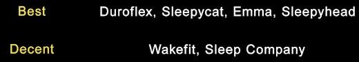 Duroflex sleepycat emma and sleepy head fairs very well in terms of both product and service. Wakefit fares well in terms of product but there have been few reports of service not being prompt enough. while there were questions about the sleep company scientific claims.