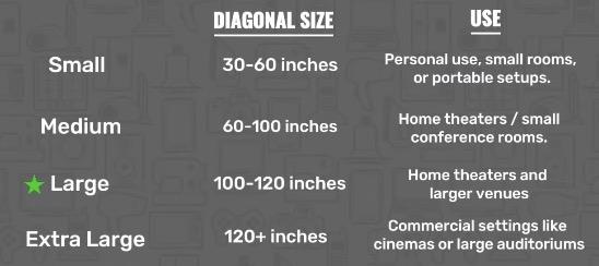 For larger sizes, you can choose to project directly on the wall or for a better experience, you can purchase a projector screen to mount on the wall or the ceiling. 100 to 120 in is the most common projection size in a home scenario.