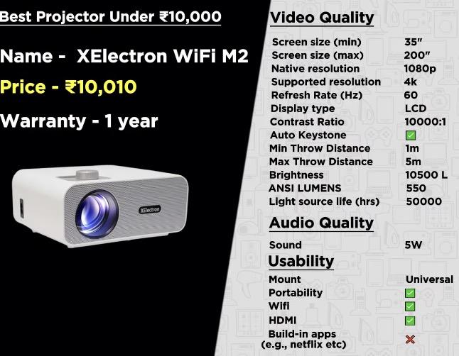 The XElectron WiFi M2, with a 10,000 to 1 contrast ratio and a 1080p native resolution with 4K supported resolution this gives a decent picture quality at this budget. It does include Wi-Fi, Bluetooth and supports streaming from both Android and iOS devices.
