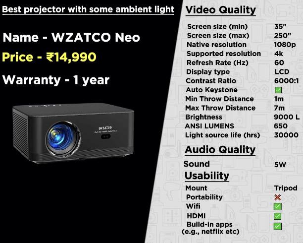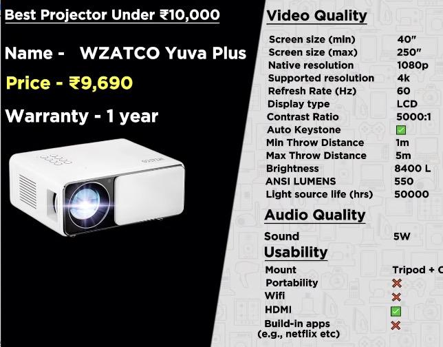 The WZATCO Yuva plus with a 550 lumens ANC brightness and a 5, to1 contrast ratio. This is a good option in the budget segment. Remember, this does not include Wi-Fi and does not support streaming apps. So you will need an extra Streaming Stick along with this projector.
