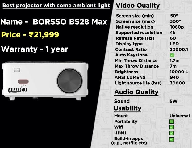 The Borso BS28 Max can project up to 300 inches with a 20,000 is to 1 contrast ratio and 940NC lumens. So, it can be used in rooms with moderate ambient light. It also includes Android with major built-in apps for easy streaming directly from the projector, although many users have complained of the built-in Android being slow and lagging and recommend using a streaming stick instead.