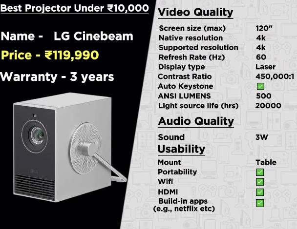 The LG Cinebeam Q that you see in the image. This is a 4K laser projector with an outstanding contrast ratio of 41/2 lakhs is into one.