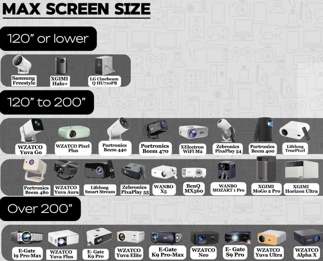 Now, except for the LG CineBeam and the Samsung Freestyle models that we’ve compared, which support a maximum size of about 100 inches, all other projectors compared Support over 120 inches in size. Remember, this is the diagonal size, not the width.