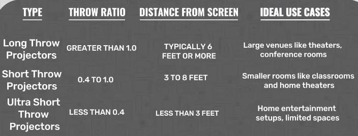 In addition to the display size, your choice of projector will also depend on the distance you can keep the projector from the wall that you’re projecting on. In general, some projectors publish a throw ratio, which shows how far the projector needs to be placed for the size that you want to project.