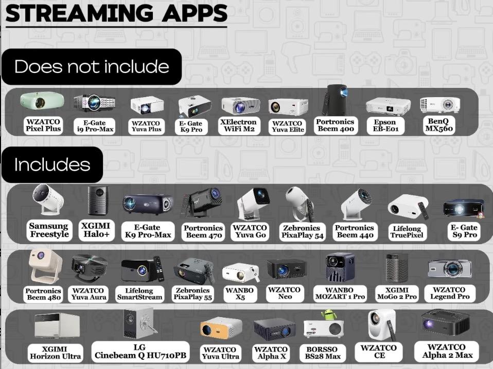 In the given image, you see projectors that do and do not support built-in apps. Most projectors do support Wi-Fi and Bluetooth, which are essential for wireless streaming mirroring from your smartphone and connecting your external speakers wirelessly.
